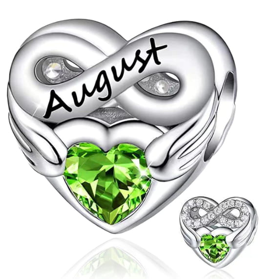 Koralik w kształcie serca z wygrawerowanym napisem August- Sierpień. Charms zdobią zielone i białe cyrkonie.