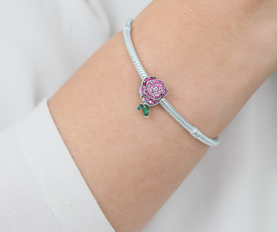 Srebrny charms w kształcie róży, wysadzany lśniącymi różowymi i zielonymi cyrkoniami, to pełen elegancji i wyrafinowania dodatek do biżuterii modułowej. Błyszczące kamienie podkreślają wyjątkowy charakter kwiatu, symbolizującego miłość i pasję. Misternie wykonane detale sprawiają, że charms zachwyca swoim blaskiem i precyzją. Idealny jako romantyczny akcent w bransoletce lub prezent dla kogoś wyjątkowego. Dodaj odrobinę luksusu i magii do swojej kolekcji!