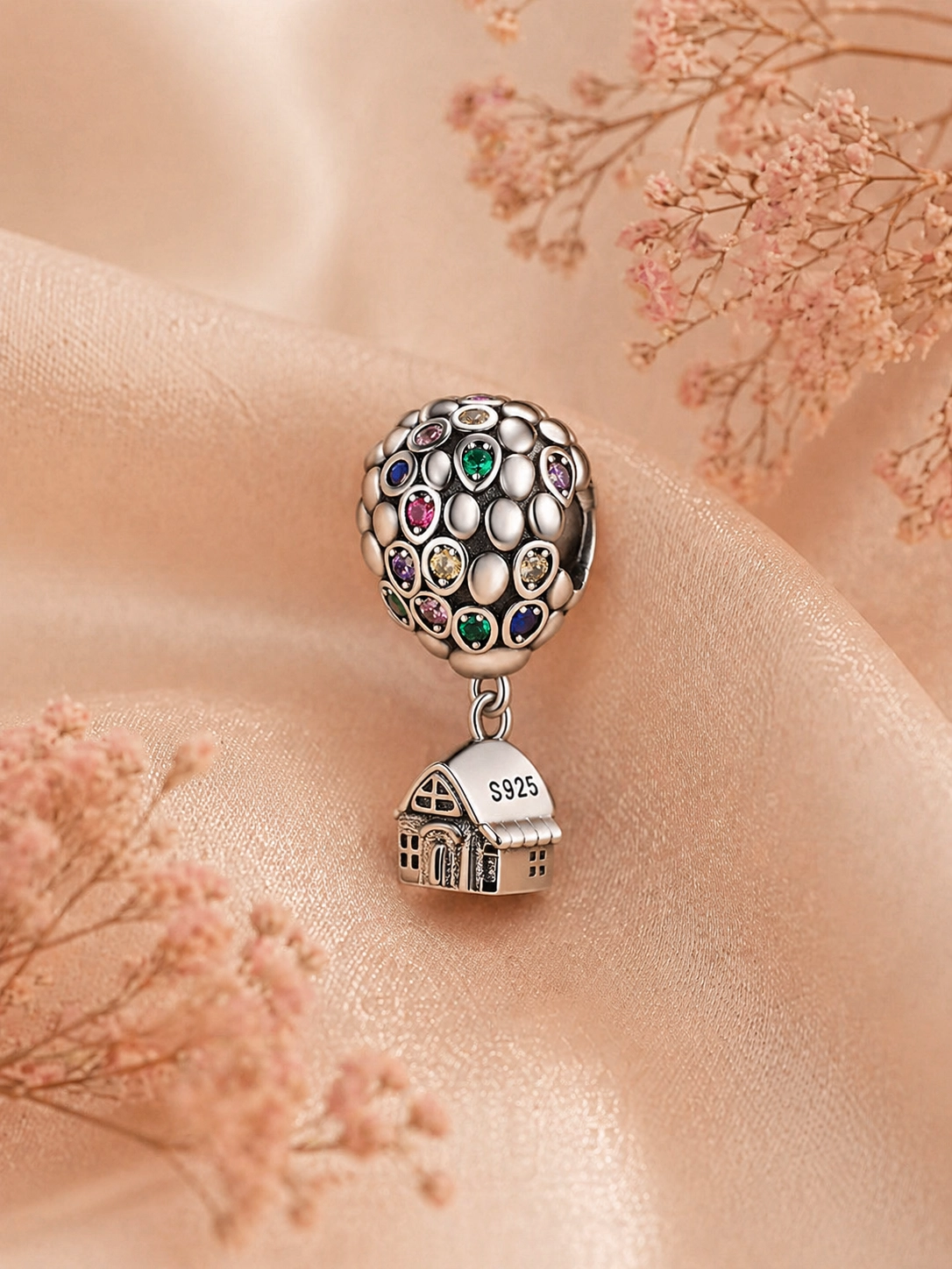 Głównym elementem charmsa jest ozdobna kula wysadzana wielokolorowymi cyrkoniami, które mienią się w świetle niczym najpiękniejsze chwile zapisane w pamięci. Każdy kolor symbolizuje emocje, radość i różnorodność doświadczeń, które tworzą naszą historię. U dołu zawieszki znajduje się uroczy domek – znak stabilności, miłości i miejsca, do którego zawsze chce się wracać.
