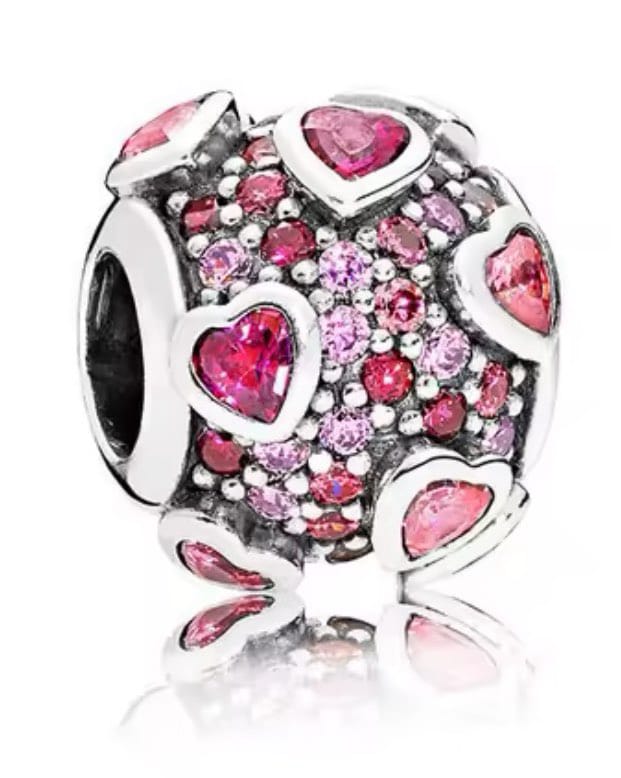 Ten niezwykle kobiecy charms zachwyca blaskiem różowych i czerwonych cyrkonii, które harmonijnie tworzą elegancki wzór. Serduszka, misternie ułożone na powierzchni, przywołują ciepłe emocje i piękno miłości.
