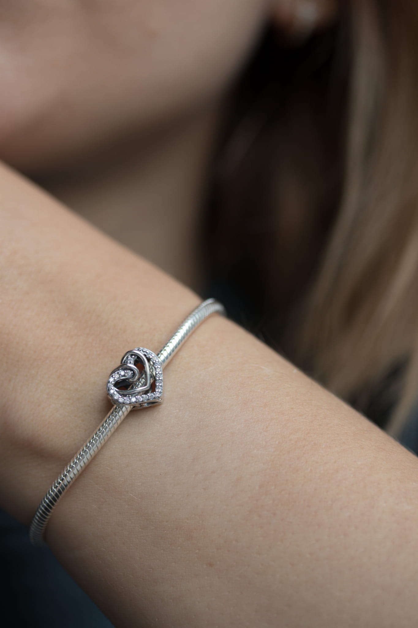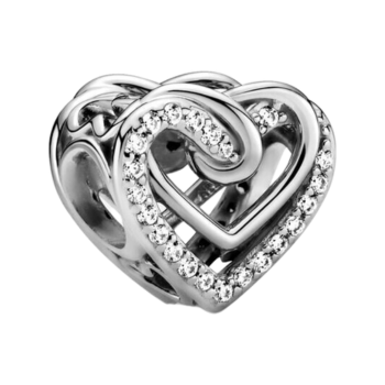 Przeplatające się serca symbolizują wzajemną miłość i nierozerwalną więź, co czyni ten charms idealnym wyborem dla osób chcących wyrazić swoje uczucia poprzez biżuterię. Subtelne cyrkonie dodają blasku, nie przytłaczając delikatnego wzoru.