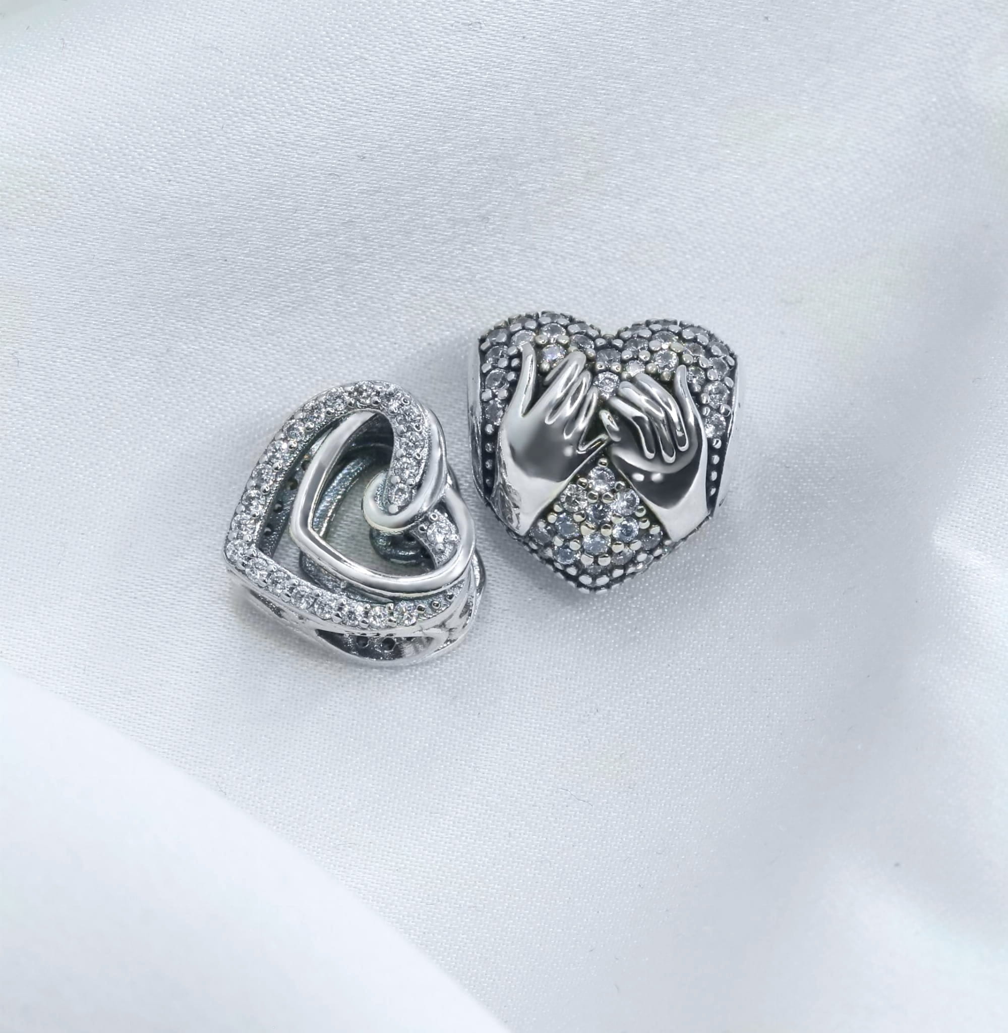 Srebrna zawieszka Charms Wzajemna Miłość to symbol delikatności i głębokiego uczucia, idealnie pasujący do biżuterii modułowej, takiej jak bransoletki Pandora. Zawieszka składa się z dwóch przeplatających się serc – jedno z nich ozdobione jest lśniącymi cyrkoniami, a drugie zachowuje klasyczną, srebrną formę, co tworzy piękny kontrast i nadaje jej eleganckiego, ażurowego charakteru.