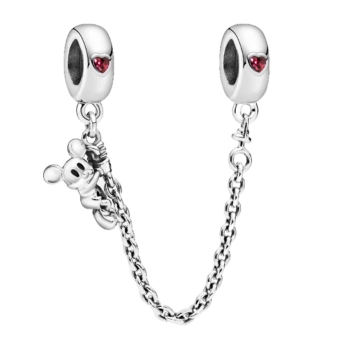 Srebrna zawieszka Charms Łańcuszek Zabezpieczający z Myszka i Czerwonymi Sercami do biżuterii modułowej